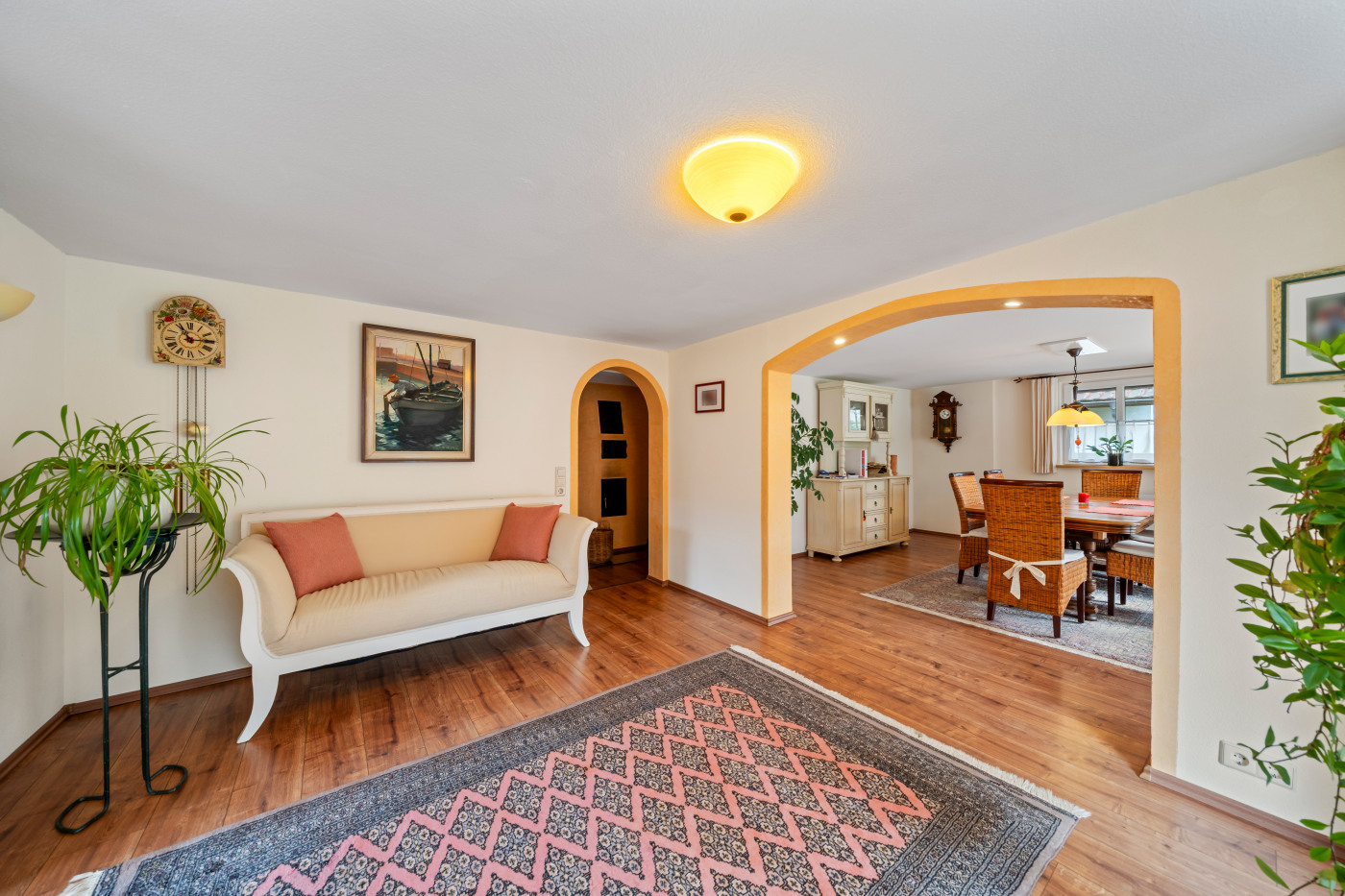 Erdgeschoss: Hier befinden sich ein großzügiges Wohnzimmer mit Kachelofen (befeuert vom Hausgang aus), ein offener Essbereich und eine Küche, die durch elegante Rundbögen voneinander abgetrennt sind. Große Fensterfronten sorgen für Licht und direkten Zugang zur überdachten Terrasse. Ein Gäste-Bad mit Dusche, WC und Waschbecken rundet das Angebot ab.