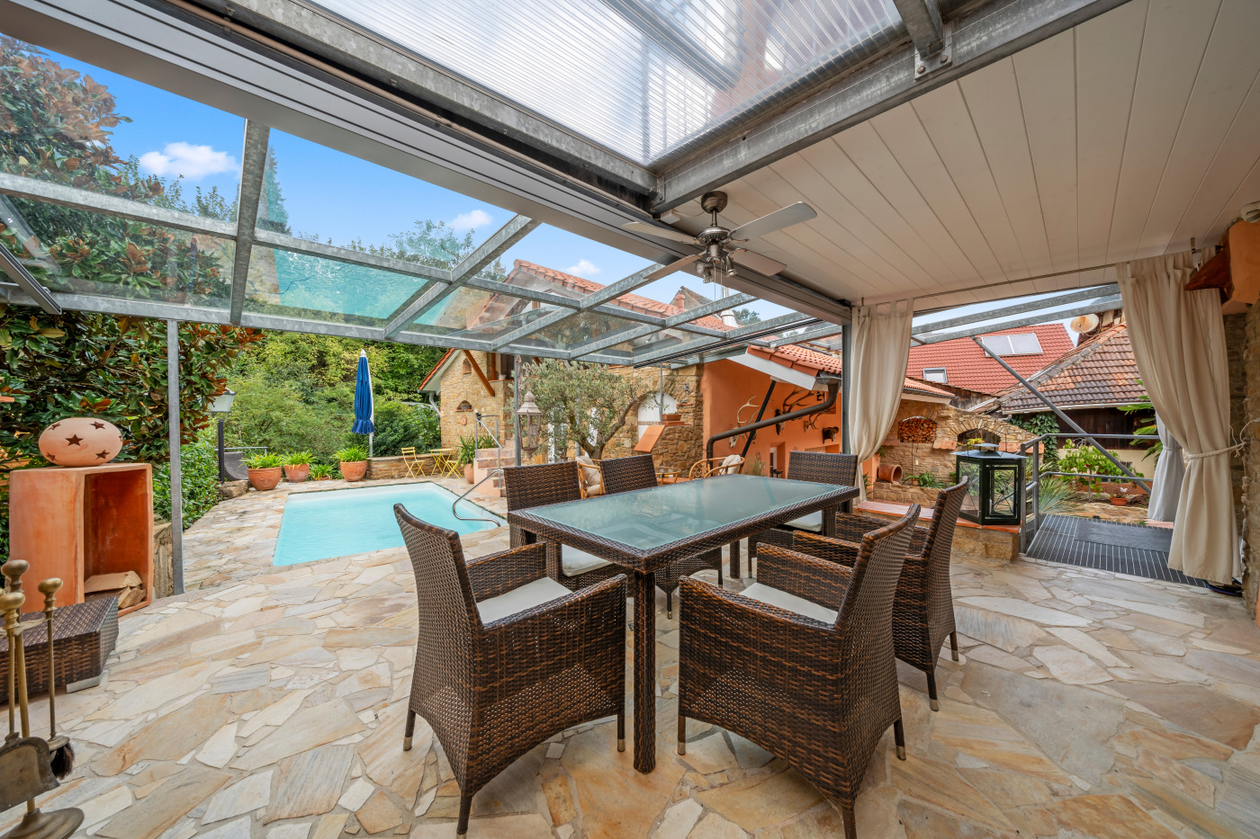 Durch ein repräsentatives Hoftor gelangen Sie in den liebevoll gestalteten Außenbereich, der mit südländischem Charme begeistert. Zahlreiche Sitzplätze, eine romantische Grillstelle und eine überdachte Terrasse mit offenem Kamin laden zum Verweilen ein. Der Poolbereich, umrahmt von mediterranen Pflanzen, vermittelt echtes Urlaubsgefühl. Zusätzlich bietet ein separates Pool- und Gästehaus mit ca. 60 m² Nutzfläche weitere Rückzugsmöglichkeiten.